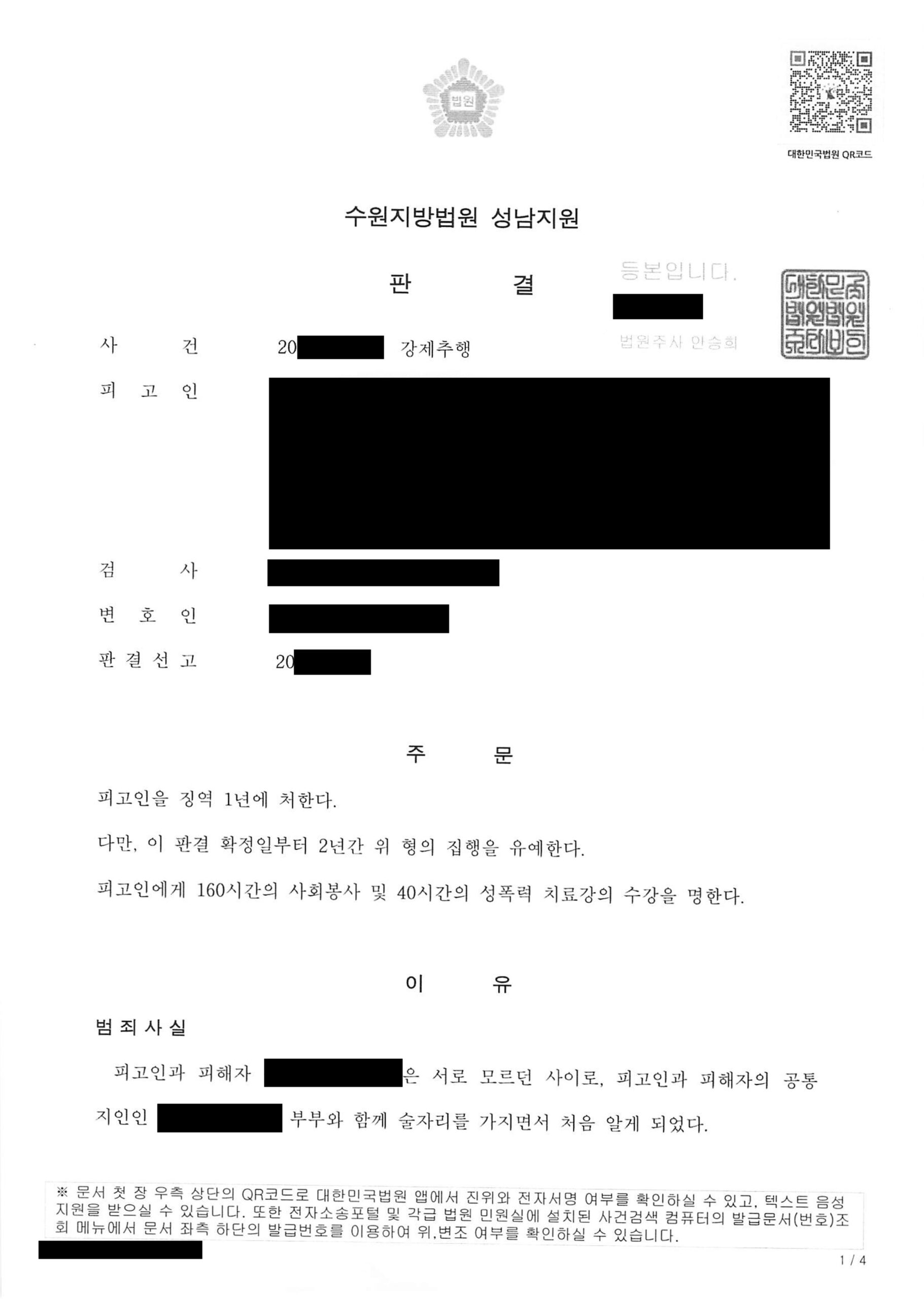 그 결과, 법원은 가해자에게 징역 1년형을 선고하고, 사회봉사 명령과 성폭력 치료 강의 수강 명령을 부과했습니다.