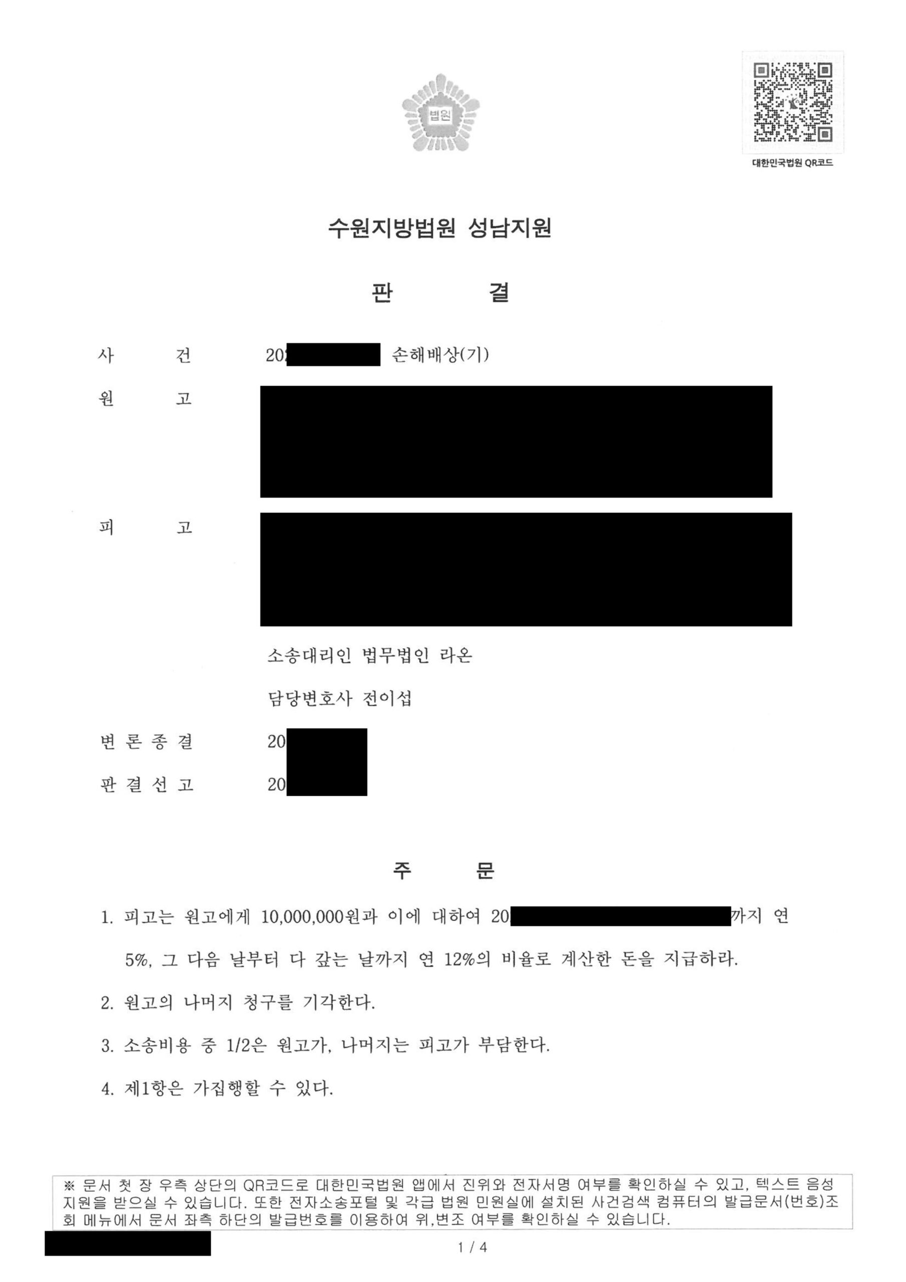 결과, 법원은 원고가 청구한 금액 3,000만 원에서 2,000만 원이 대폭 감액된 1,000만 원을 지급하라는 판결을 내렸습니다.