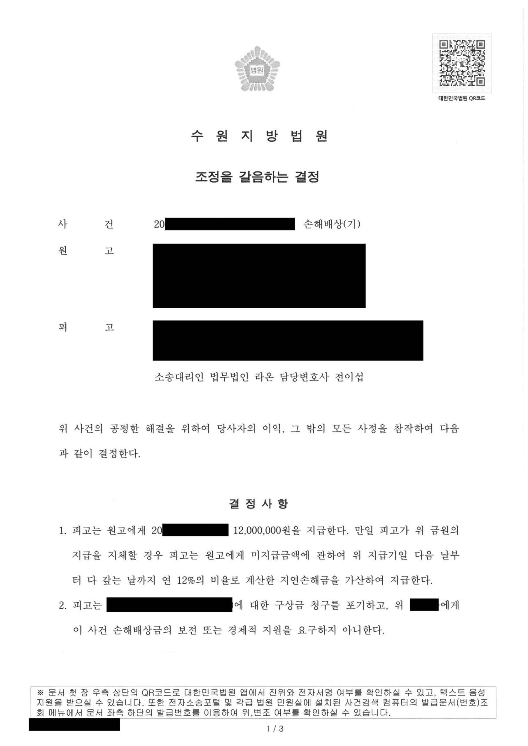 결과, 법원은 조정을 갈음하는 결정을 통해 원고가 청구한 위자료 3,500만 원을 대폭 감액하여 1,200만 원을 지급하라고 판결했습니다.