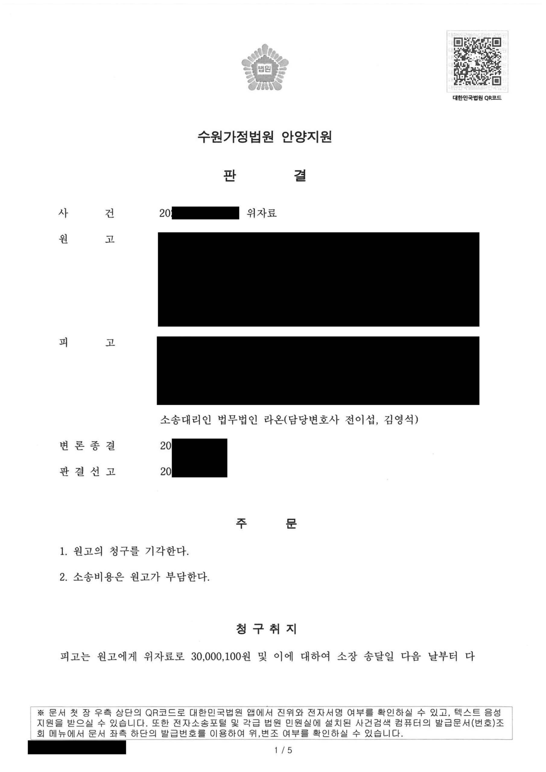 결과 법원은 원고의 청구를 전부 기각하였고, 의뢰인의 억울함을 완전히 해소할 수 있었습니다.