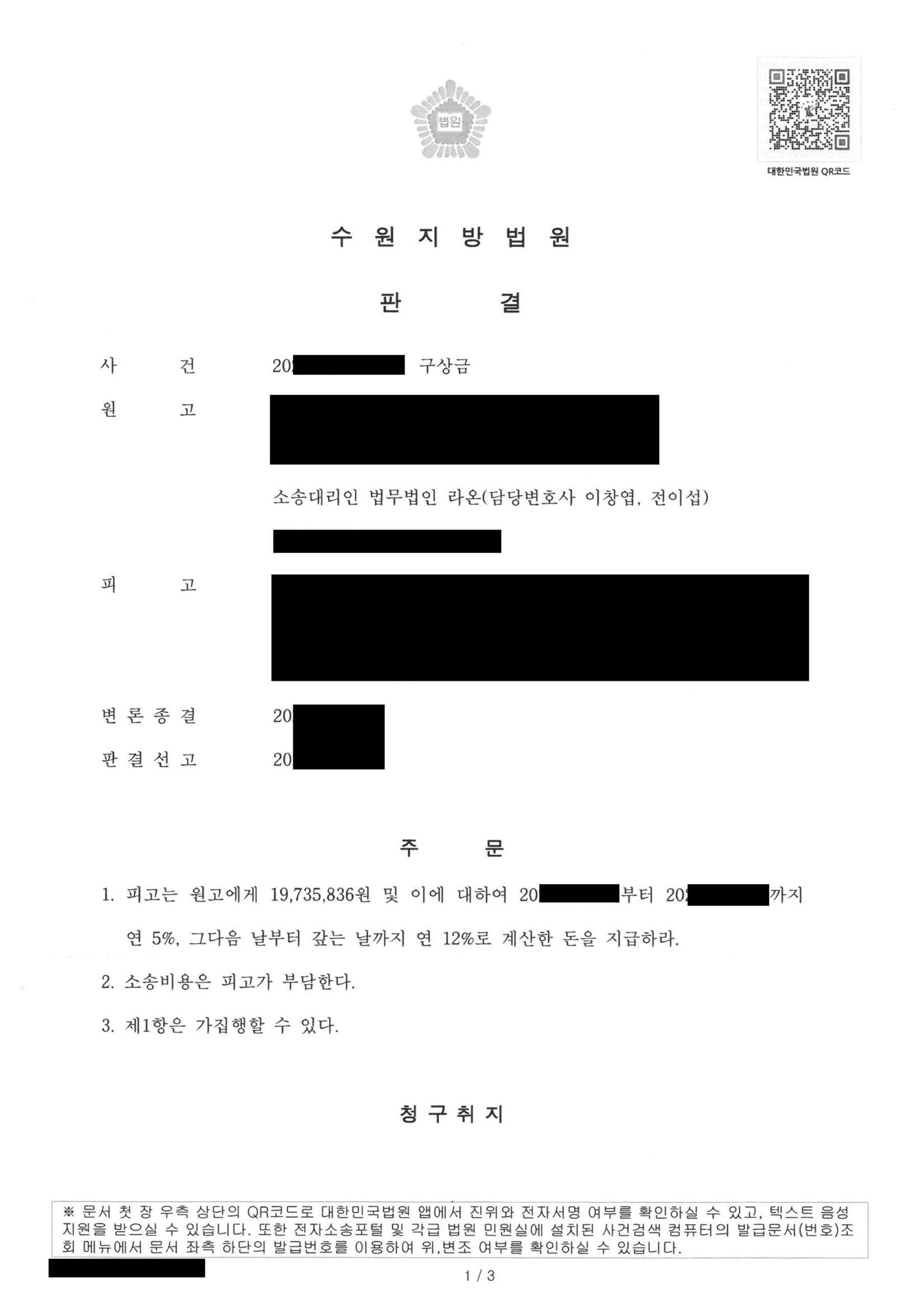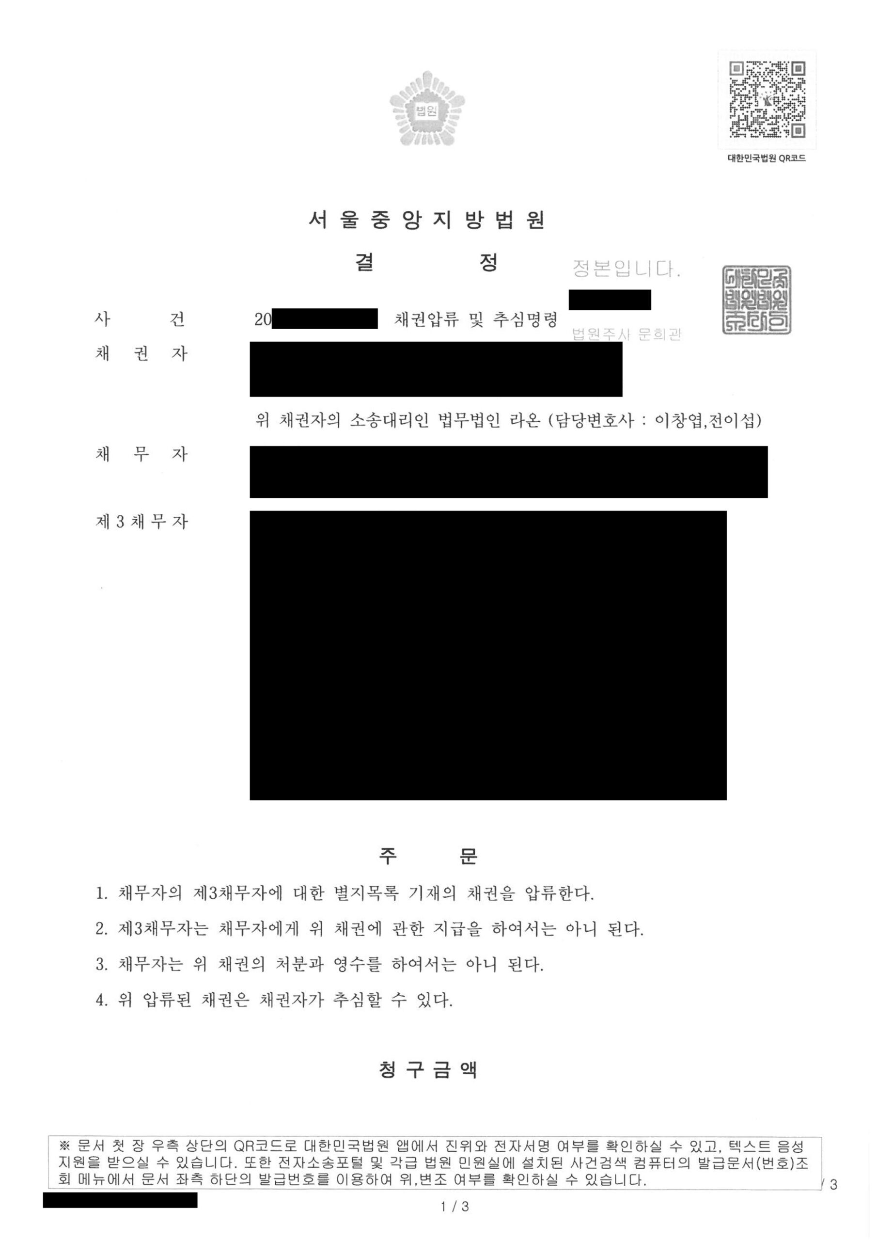 하지만 상대방이 판결을 이행하지 않자, 강제집행 절차를 통해 구상금 전액과 소송 비용까지 회수할 수 있었습니다.