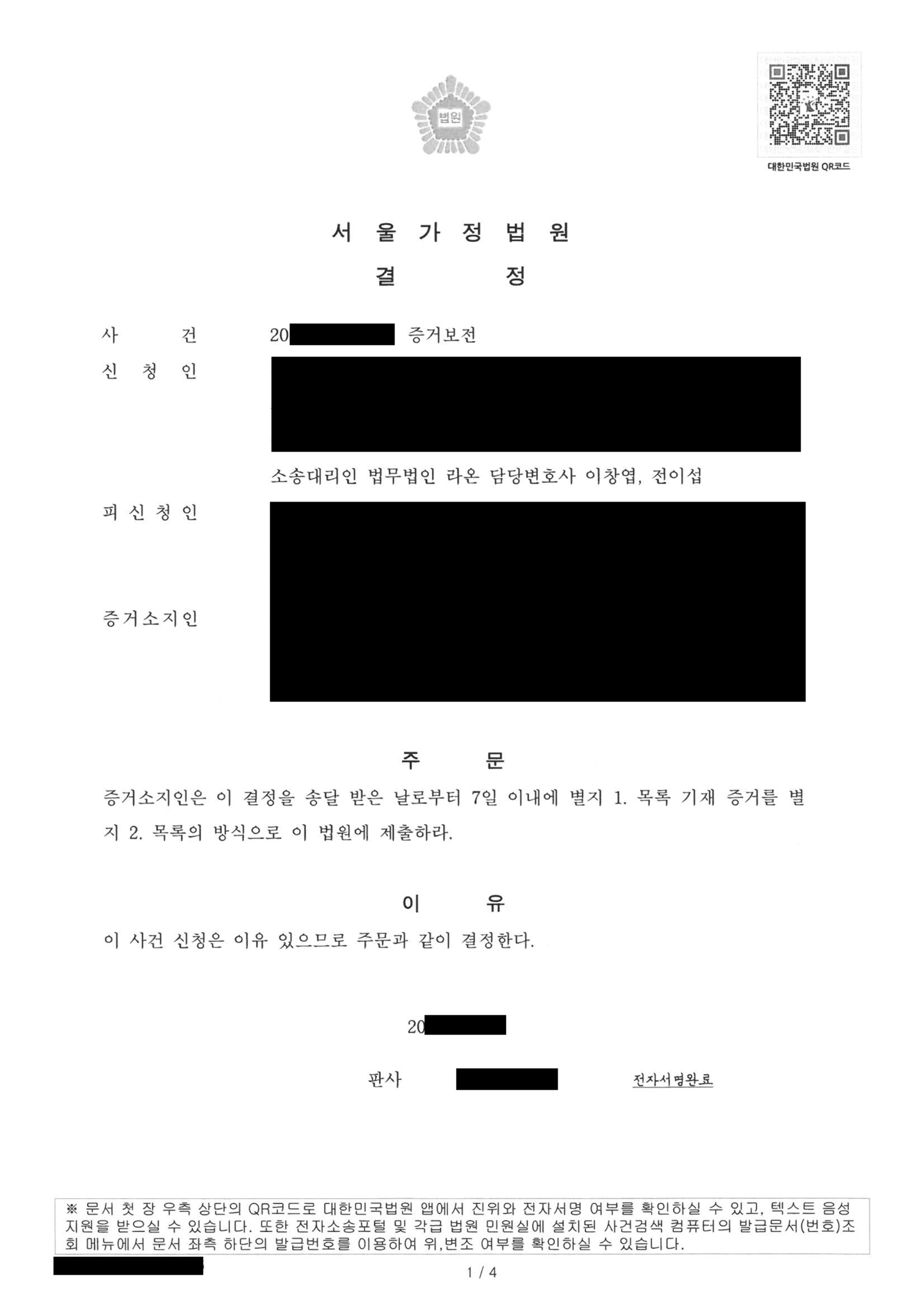 결과, 법원은 이를 인정하였고 의뢰인은 CCTV 영상을 신속하게 확보할 수 있었습니다.