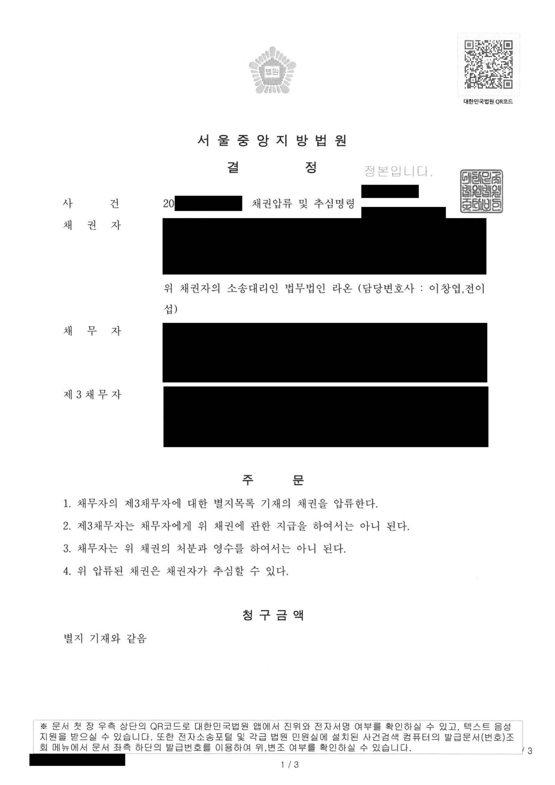 [채권압류및추심명령] 소액사건심판 판결 후 채권압류 및 추심명령 인용 받아 원금 및 지연손해금, 집행 비용 전액 회수한 사례